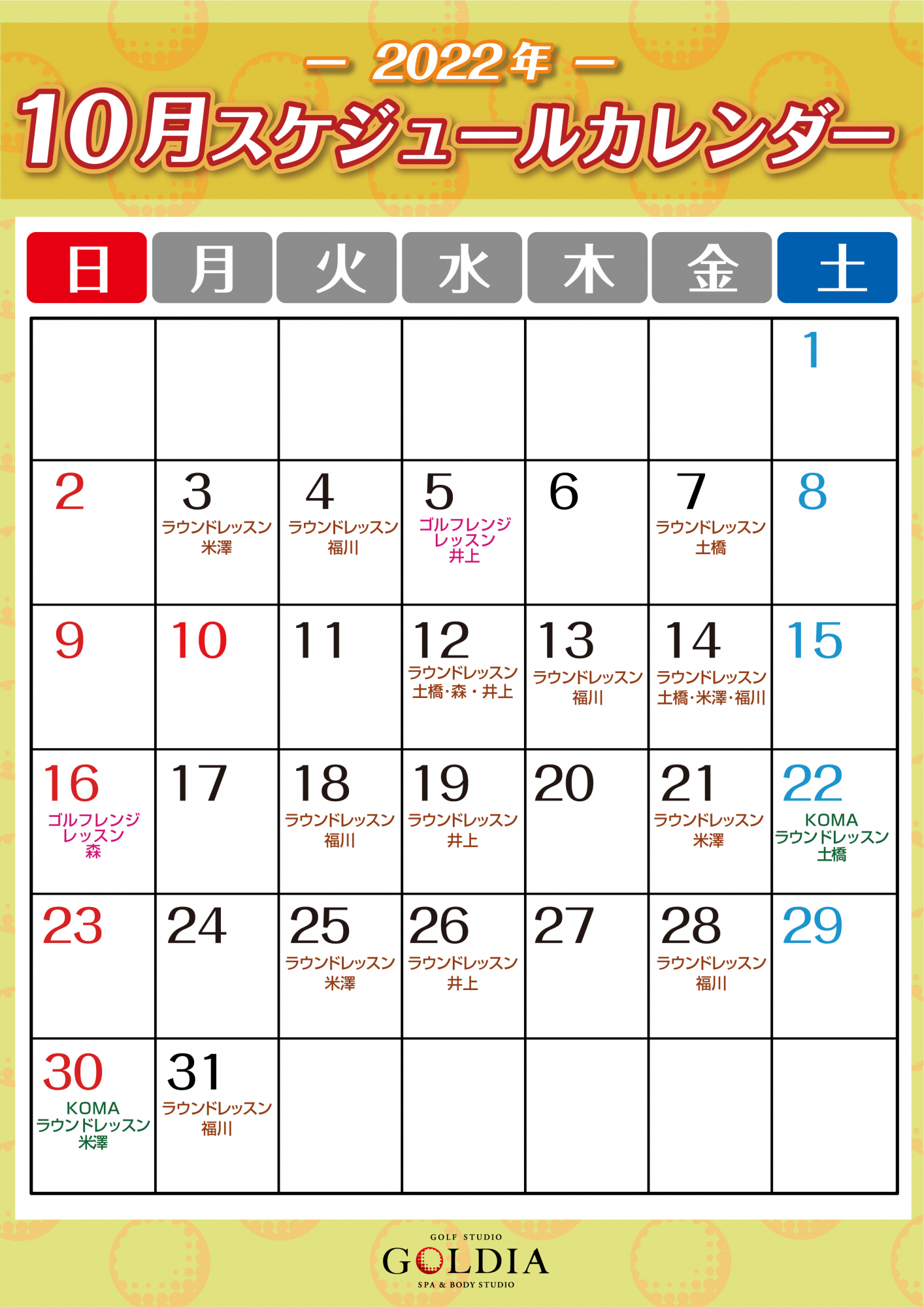 10月間スケジュールカレンダー